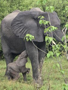 Vi fick också se en ung elefantunge, bara två-tre dagar gammal, som fick di av sin mamma under en lugn och fridfull morgon.
